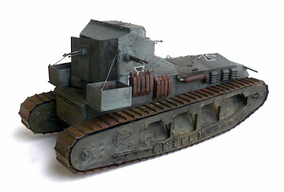 This armoured fighting vehicle was intended for fast mobile assaults. Although the track design appears more "modern" than the British Tanks Mark I to V, it was directly derived from Little Willie, the first tank prototype, and was unsprung. The crew compartment was a fixed, polygonal turret at the rear of the vehicle, and two engines of the type used in contemporary double-decker buses were in a forward compartment, driving one track each.